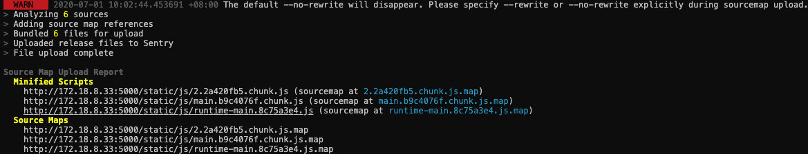 接着配置 sentry-cli releases files test004 upload-sourcemaps --url-prefix 'http://172.18.8.33:5000/static/js' './build/static/js/'