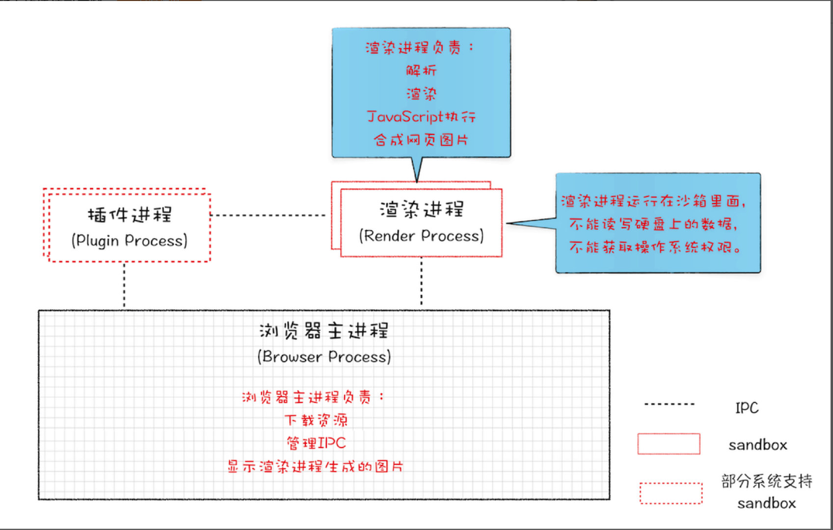 渲染进程。核心任务是将 HTML、CSS 和 JavaScript 转换为用户可以与之交互的网页,排版引擎 Blink 和 JavaScript 引擎 V8 都是运行在该进程中,默认情况下,Chrome 会为每个 Tab 标签创建一个渲染进程。出于安全考虑,渲染进程都是运行在沙箱模式下。