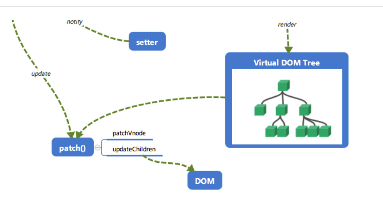 在修改对象的值的时候,会触发对应的 setter, setter 通知之前「依赖收集」得到的 Dep 中的每一个 Watcher,告诉它们自己的值改变了,需要重新渲染视图。这时候这些 Watcher 就会开始调用 update 来更新视图,当然这中间还有一个 patch 的过程以及使用队列来异步更新的策略,这个我们后面再讲。